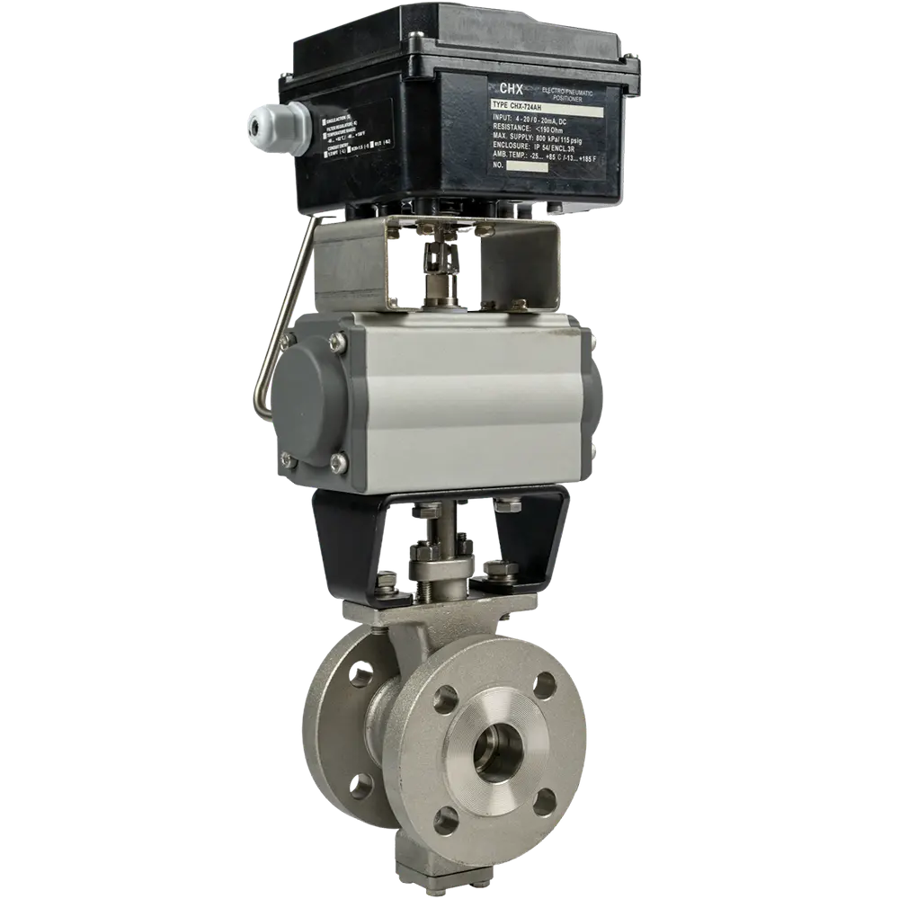В закрытом положении V-образный вырез сегмента располагается так, что перекрывает проход рабочей среды. При открытии сегмент поворачивается, открывая проход. Форма V-образного выреза позволяет точно дозировать объем протекающей среды в зависимости от угла поворота сегмента. Напряжение сдвига, возникающее в месте контакта сегмента с проточкой, помогает эффективно проходить через частицы и волокна, предотвращая их застревание.